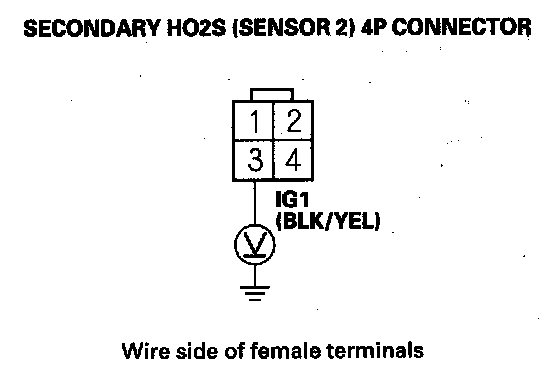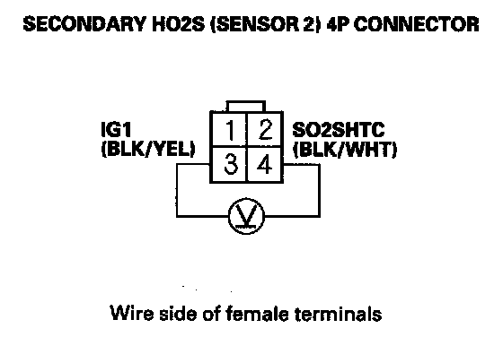 11. Measure voltage between secondary HO2S (Sensor 2) 4P connector terminals No. 3 and No. 4.
