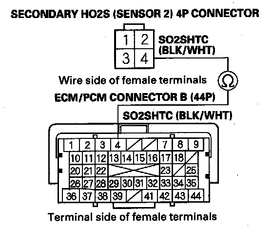 20. Check for continuity between secondary HO2S (Sensor 2) 4P connector terminal No. 4 and ECM/PCM connector terminal B4.