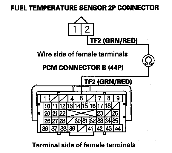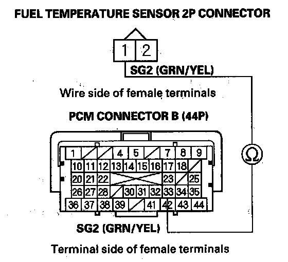 19. Check for continuity between fuel temperature sensor 2P connector terminal No. 2 and PCM connector terminal B5.