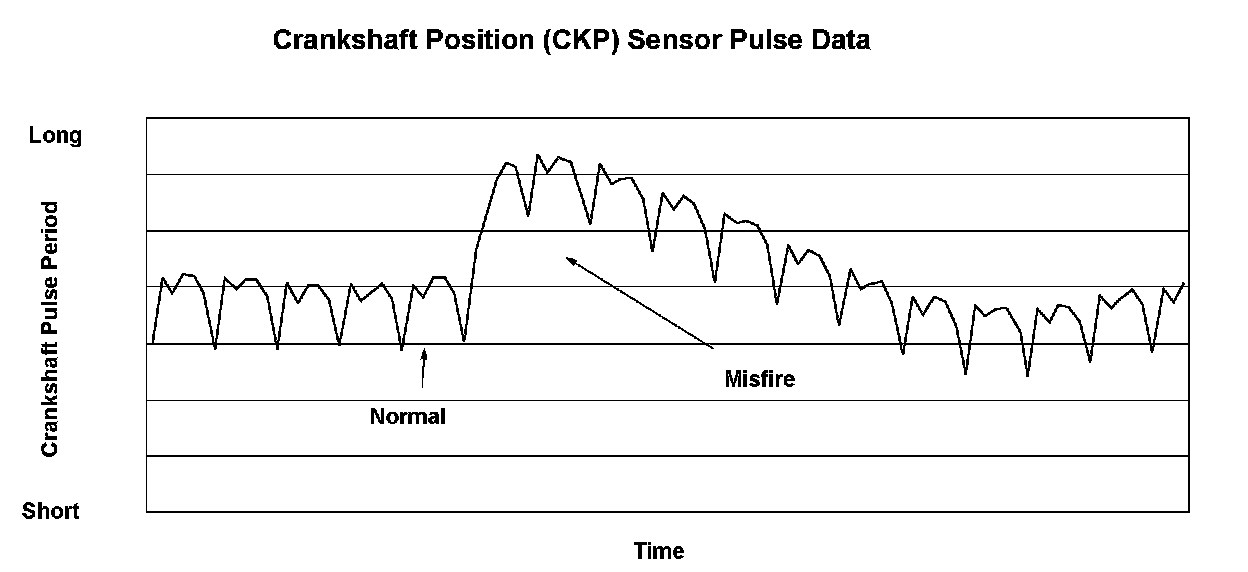 The crankshaft vibrates slightly when each cylinder fires. If a misfire occurs, the crankshaft rotation speed changes rapidly. The engine control module (ECM)/powertrain control module (PCM) monitors the crankshaft rotation speed based on the output pulses from the crankshaft position (CKP) sensor. By monitoring changes in the crankshaft rotation speed, the ECM/ PCM counts the number of misfires and determines which cylinder is misfiring. If more than one DTC from P0301 through P0304 has been stored while misfires in multiple cylinders are detected, a malfunction is detected and a DTC is stored. There are two types of misfire detection.