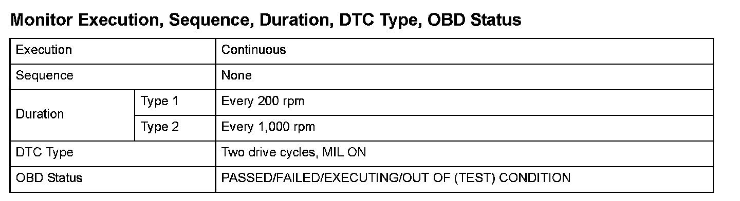 Monitor Execution, Sequence, Duration, DTC Type, OBD Status