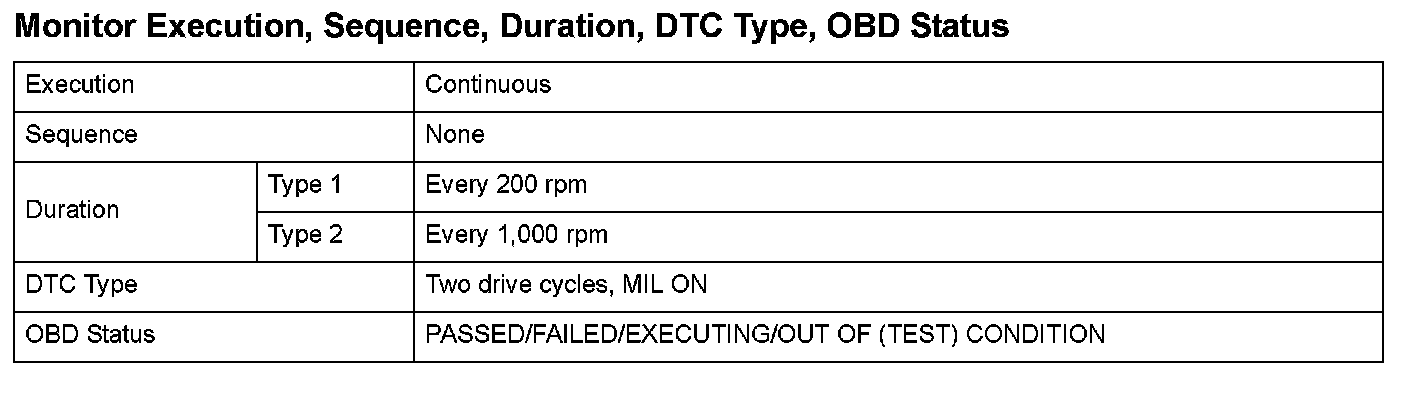 Monitor Execution, Sequence, Duration, DTC Type, OBD Status