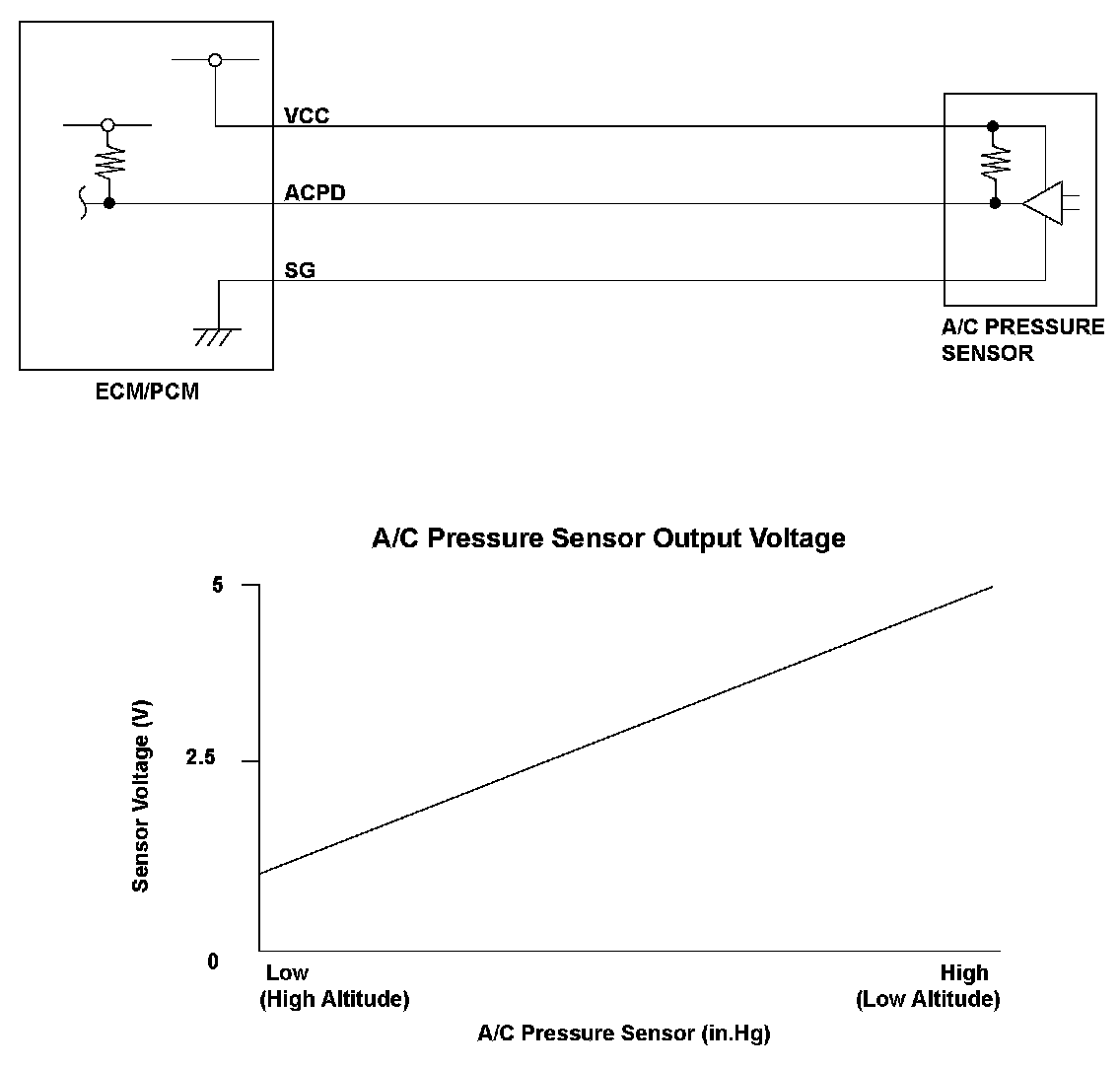 The A/C pressure sensor measures the pressure change of the air conditioning refrigerant gas. The signal from the A/C pre sure sensor is low at low voltage (when the air conditioning load is low) and high at high voltage (when the air conditioning load is high). The engine control module (ECM)/powertrain control module (PCM) compares the preset voltage to the A/C pressure sensor output voltage.