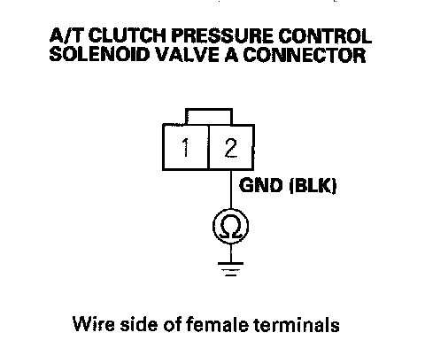 10. Measure the resistance between A/T clutch pressure control solenoid valve A connector terminals No. 1 and No. 2.