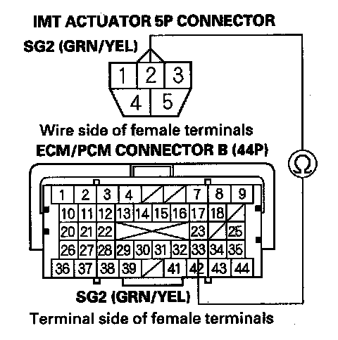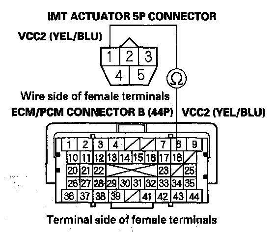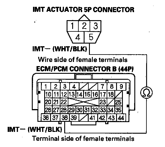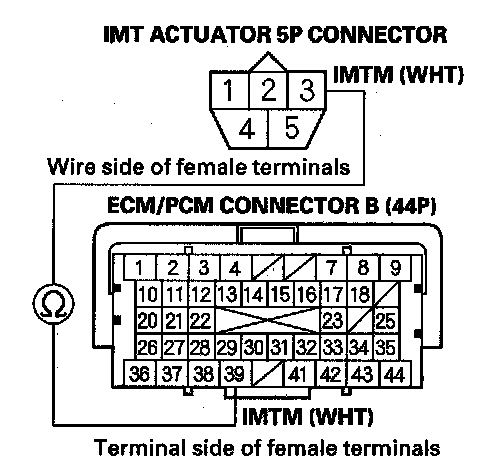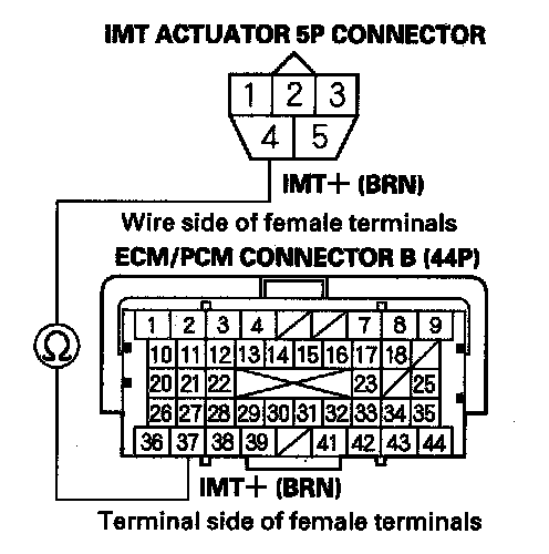 11. Check for continuity between IMT actuator 5P connector terminal No. 1 and ECM/PCM connector terminal B18.