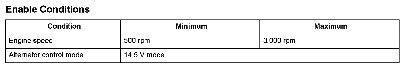 The alternator is driven by the engine, and it generates electricity to supply the necessary power to the electrical load and to charge the battery. The alternator voltage target values of 14.5 V and 12.5 V are achieved by switching the alternator control mode (controlled by the engine control module (ECM)/powertrain control module (PCM)). The alternator output signal is sent to the ECM/PCM, and it varies according to the battery's state of charge, the electrical load, and the engine speed.