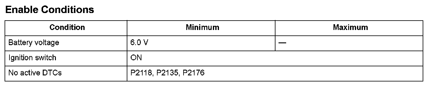 The ECM/PCM compares the throttle valve target opening angle and the actual throttle valve opening angle from TP sensor A, and when the difference exceeds the specification, the ECM/PCM detects the malfunction of the throttle actuator system and a DTC is stored.