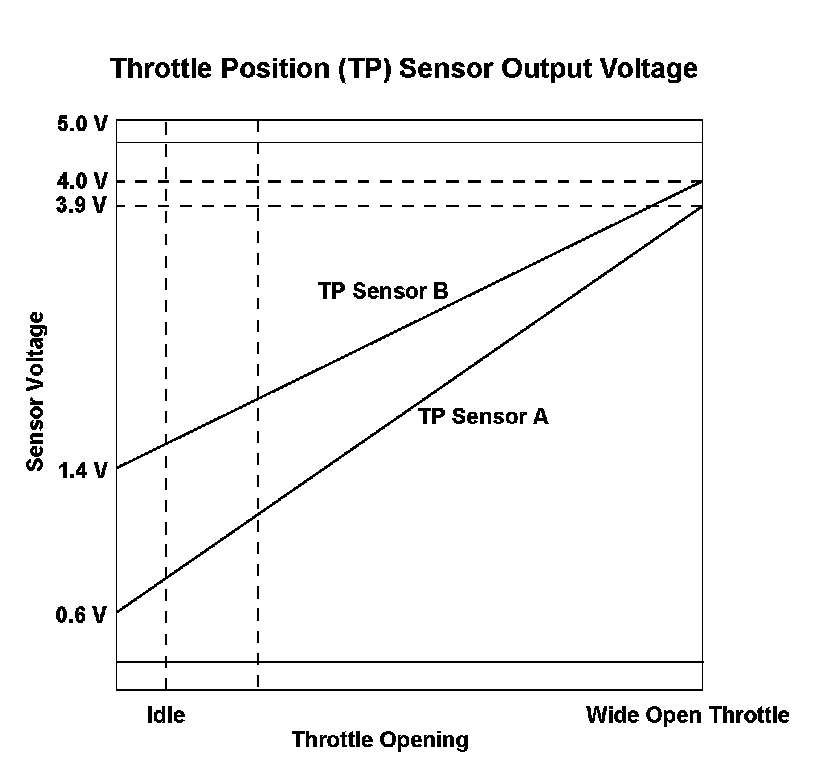 - The difference between the TP sensor A voltage and the TP sensor B voltage is 200 mV (5°) or less.