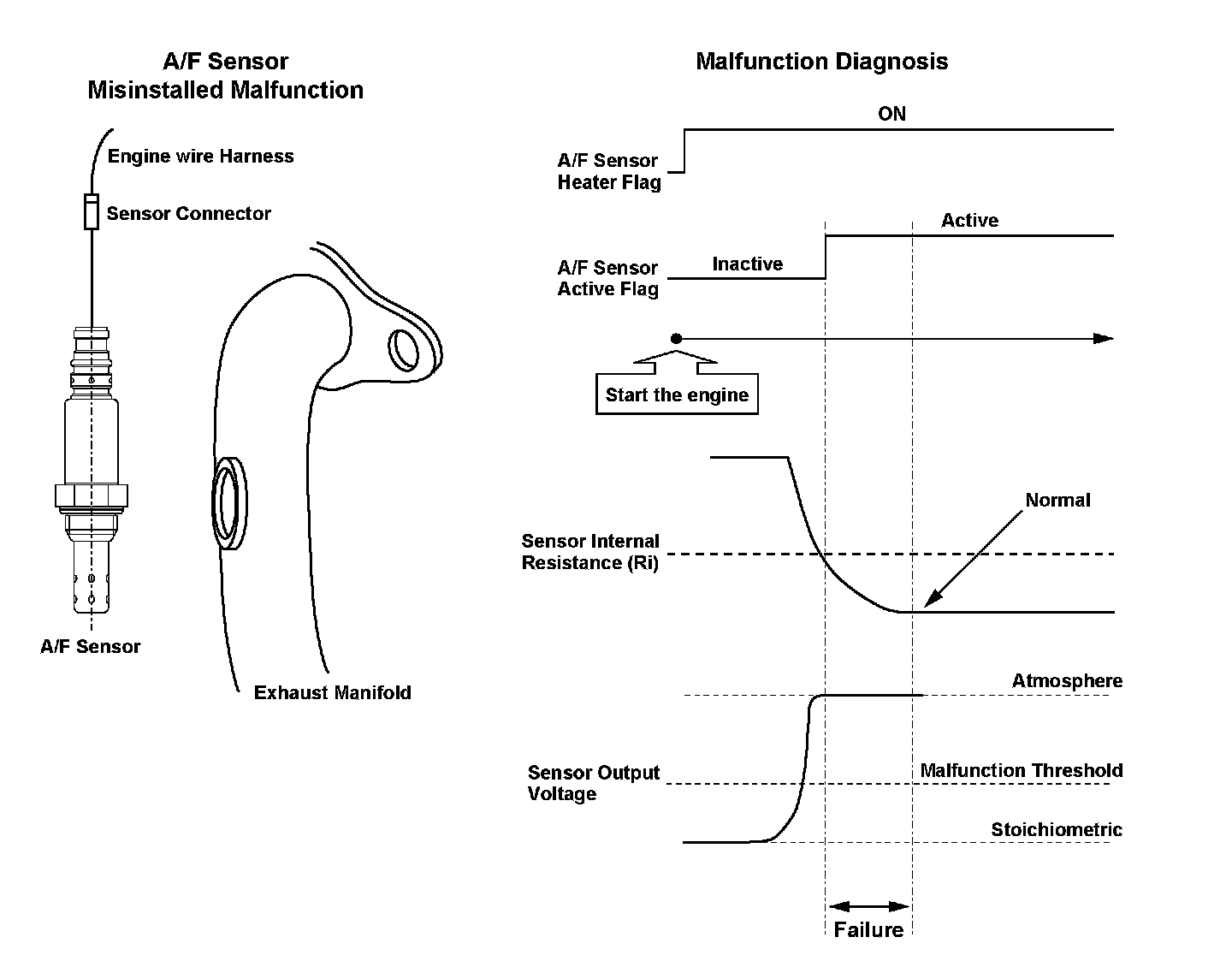 When the A/F sensor output stays out of the normal range after the A/F sensor becomes active, the engine control module (ECM)/powertrain control module (PCM) detects that the A/F sensor is not properly installed and a DTC is stored.