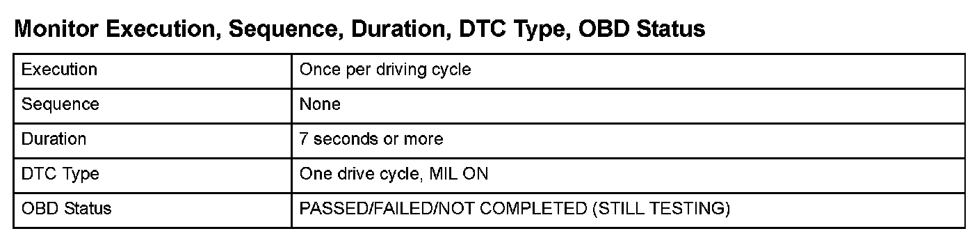 Monitor Execution, Sequence, Duration, DTC Type, OBD Status