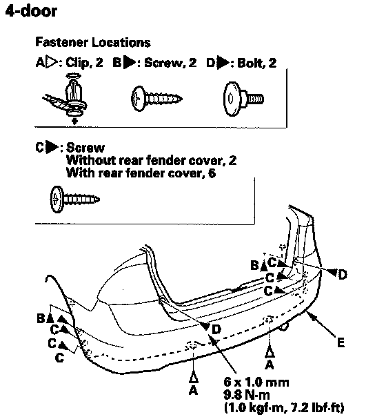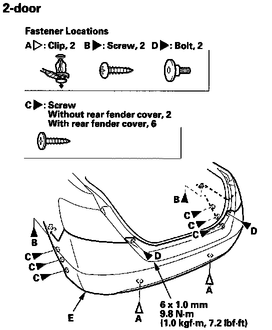 1. Remove the clips (A), screws (B, C), and bolts (D) securing the rear bumper (E).