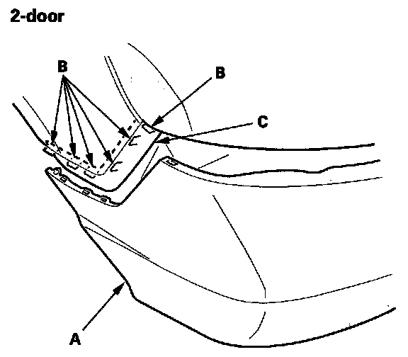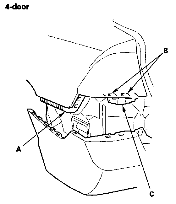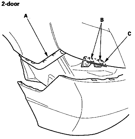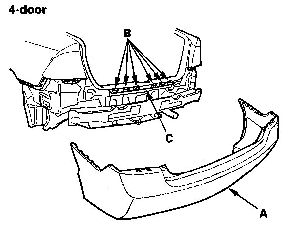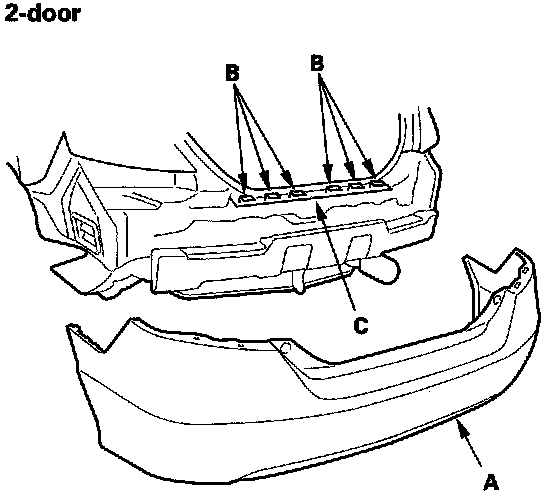 4. With the help of an assistant, pull the rear bumper to release the bumper (A) from the hooks (B) on the upper bracket (C).