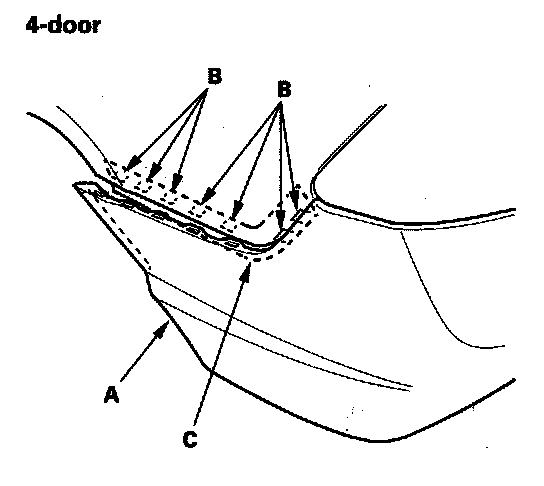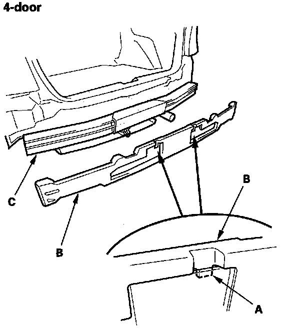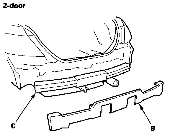 5. Remove the hooks (A) (4-door), then remove the rear bumper absorber (B) from the rear bumper beam (C).
