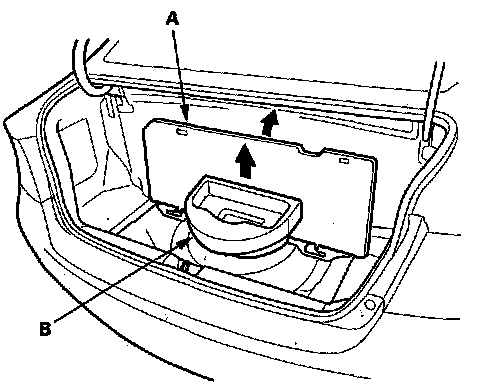 1. Pull the trunk floor (A) up, then remove the trunk tool box (B).