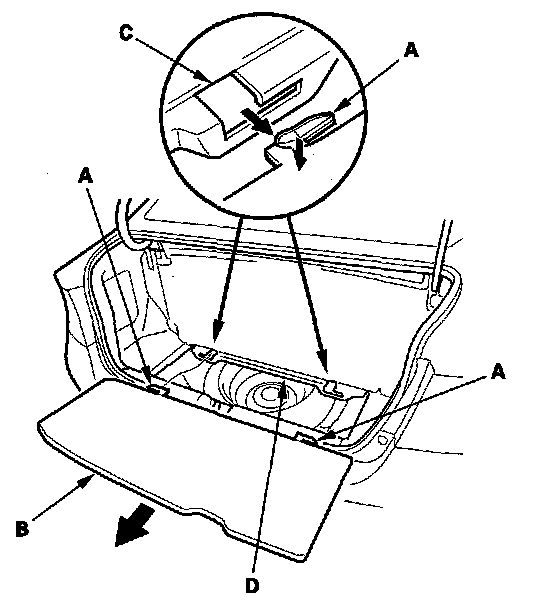 2. While pushing both hooks (A) down with your hands, pull the trunk floor (B) back to release these hooks from the holes (C) in the trunk front trim panel (D), then remove the trunk floor.