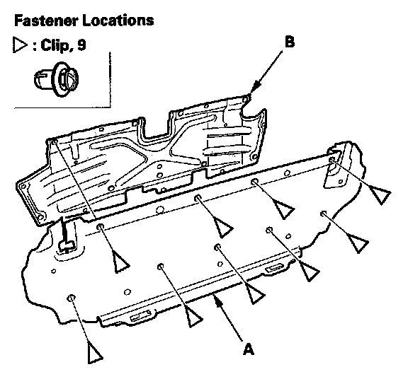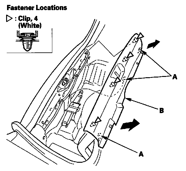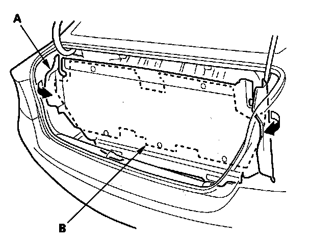 7. If necessary, remove the clips, then separate the trunk front trim panel (A) and trunk partition (B).