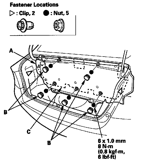 5. Remove the clips securing the trunk front trim panel (A), and using a trim tool, remove the caps (B), and remove the nuts securing the trunk partition (C).