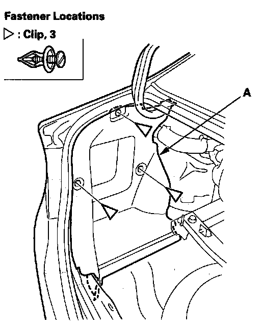 8. Remove the clips, then remove the trunk side trim panel (A).