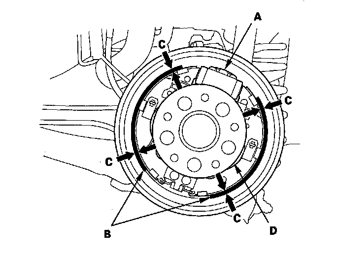 6. Measure the brake lining thickness (C). Measurement does not include brake shoe thickness.