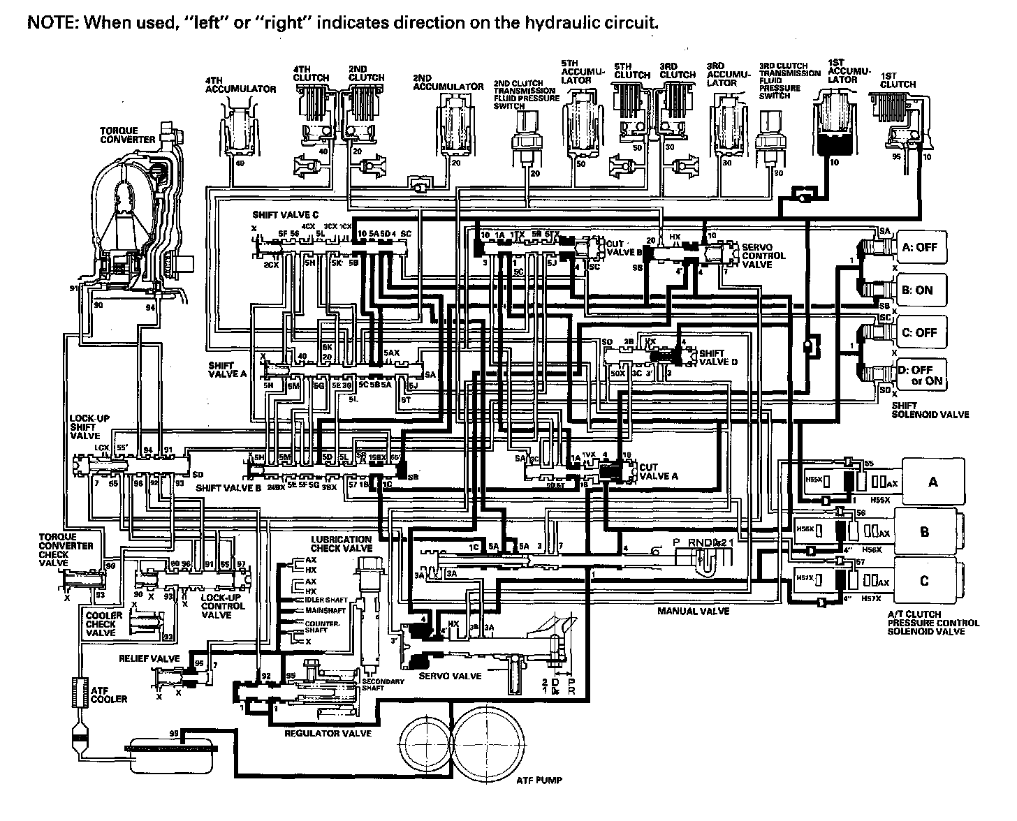 ^ Line pressure travels up and through shift valve C (5D), through shift valve B (5G), and then up to shift valve A (20) to become 2nd clutch pressure. The 2nd clutch is engages by the 2nd clutch pressure.