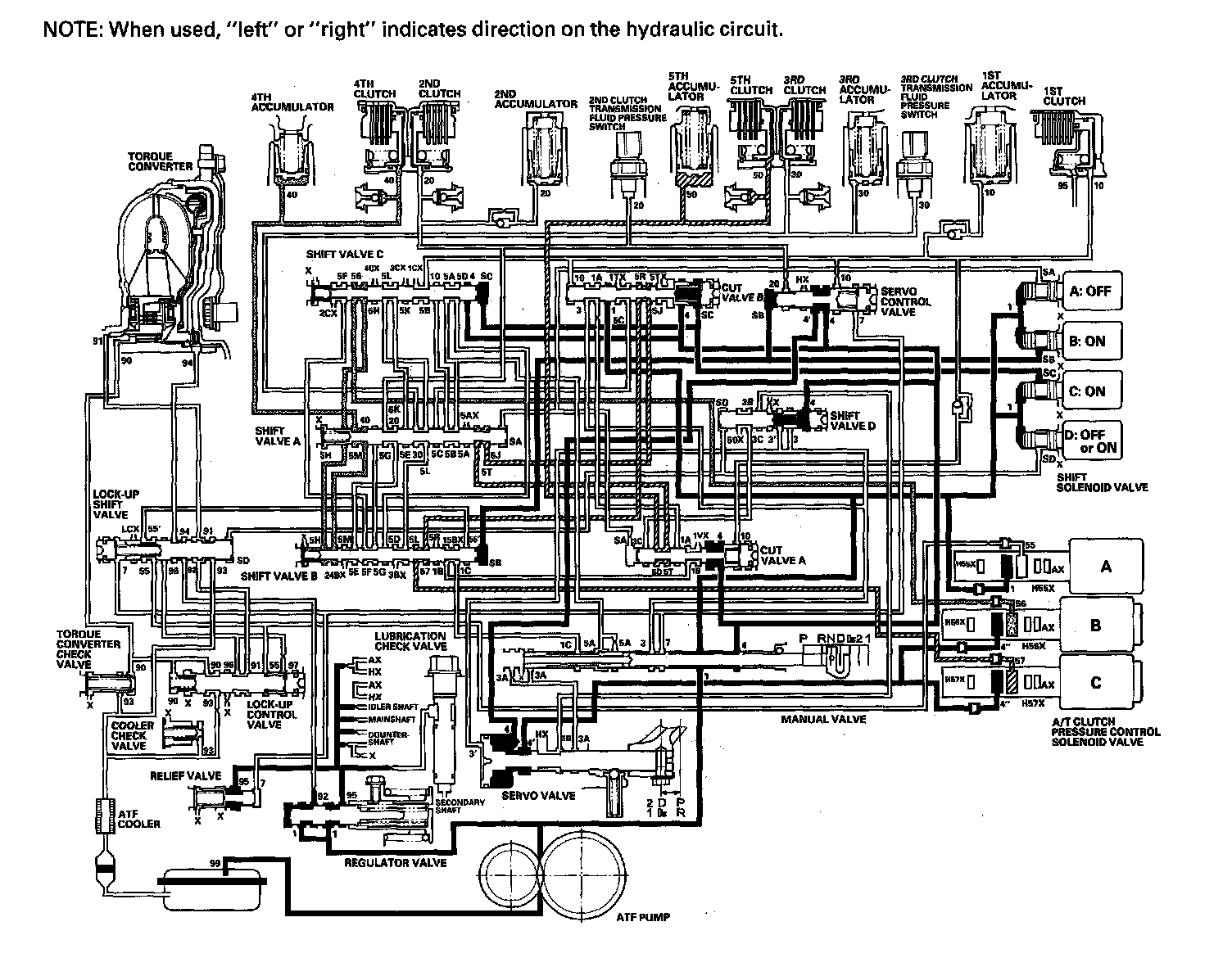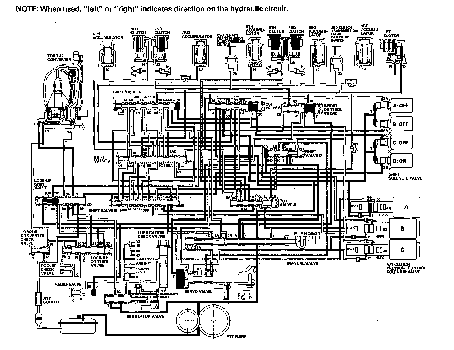 The manual valve is moved into the R position. This causes line pressure (1) to become line pressure (1), (3), and (7) at the manual valve. The PCM turns shift solenoid valves C and D ON, and shift solenoid valves A and B remain OFF. Shift solenoid valve D pressure (SD) is applied to the left end of shift valve D, causing shift valve D to move to the right side, uncovering the line pressure (3) port leading to the servo valve. Line pressure (14): from shift valve D flows to the servo valve, and pushes the servo valve to the reverse position. The PCM controls A/T clutch pressure control solenoid valve A to regulate A/T clutch pressure control solenoid valve A pressure (55), and A/T clutch pressure control solenoid valve A pressure (55) flows to the lock-up shift valve, shift valve B, the manual valve, the servo valve, shift valve D, and cut valve A. A/T clutch pressure control solenoid valve A pressure (3C) becomes 5th clutch pressure (50) at cut valve A. 5th clutch pressure (50) is applied to the 5th clutch, and the 5th clutch is engaged by the A/T clutch pressure control solenoid valve A pressure mode.