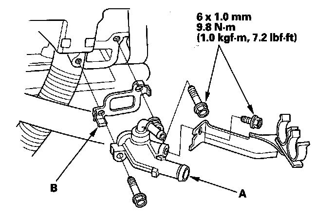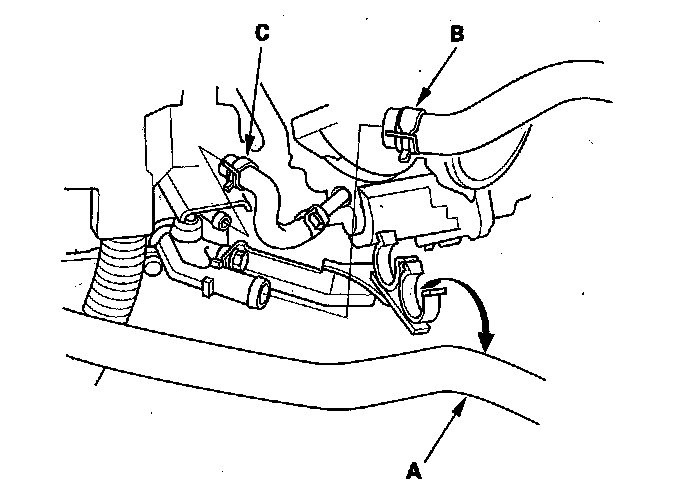 4. Disconnect the heater hose (B) and water bypass hose (C).