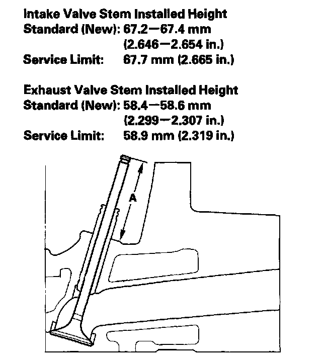 9. If the valve stem installed height is beyond the service limit, replace the valve and recheck. If it is still beyond the service limit, replace the cylinder head; the valve seat in the head is too deep.
