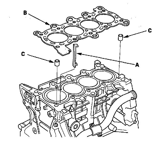 3. Install the new cylinder head gasket (B) and dowel pins (C) on the engine block. Always use a new cylinder head gasket.