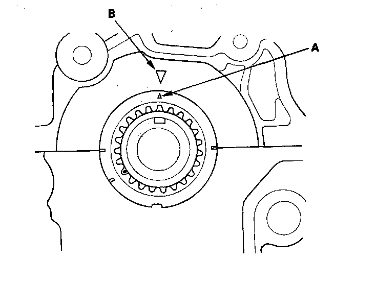 4. Set the crankshaft to top dead center (TDC). Align the TDC mark (A) on the crankshaft sprocket with the pointer (B) on the engine block.