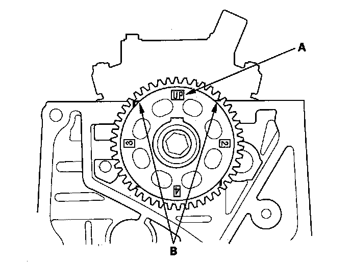 5. Set the camshaft TDC. The "UP" mark (A) on the camshaft sprocket should be at the top, and the TDC grooves (B) on the camshaft sprocket should line up with the top edge of the head.