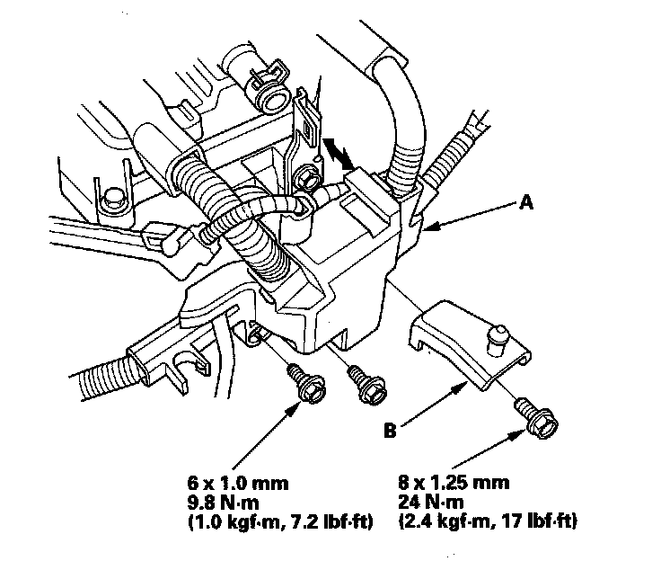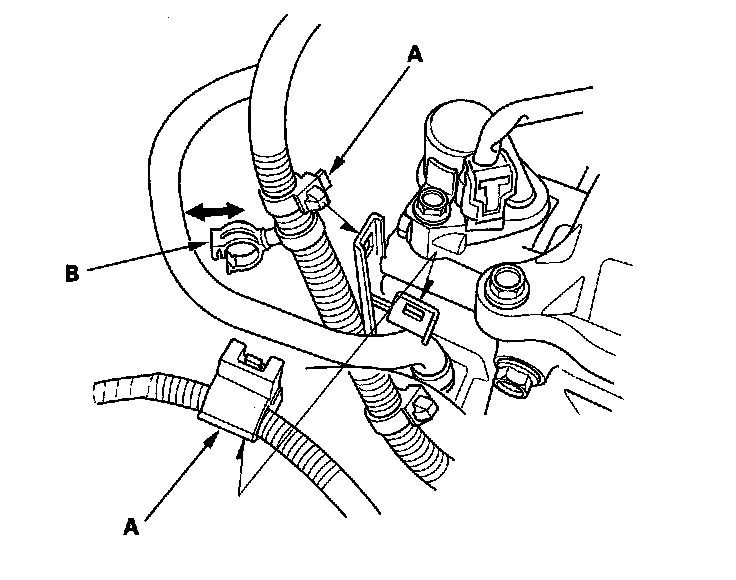 20. Install the harness clamps (A), and remove the positive crankcase ventilation (PCV) hose from the clamp (B).
