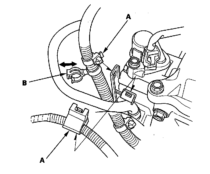 8. Remove the harness clamps (A), and remove the positive crankcase ventilation (PCV) hose from the clamp (B).