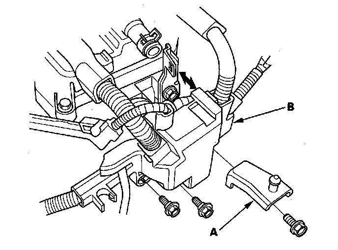 9. Remove the air cleaner housing bracket (A), then remove the harness holder (B) from the cylinder head.