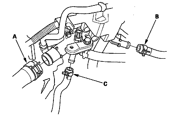 10. Disconnect the upper radiator hose (A), heater hose (B), and water bypass hose (C).