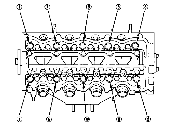16. Remove the cylinder head bolts. To prevent warpage, loosen the bolts, in sequence, 1/3 of a turn at a time; repeat the sequence until all bolts are loosened.