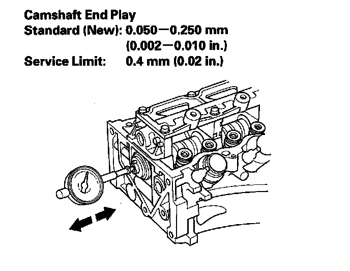 5. Zero the dial indicator against the end of the camshaft. Push the camshaft back and forth, and read the end play. If the end play is beyond the service limit, replace the thrust cover and recheck. If it is still beyond the service limit, replace the camshaft.