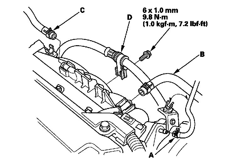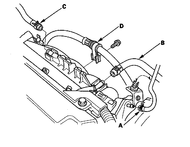 10. Install the vacuum hose (A), brake booster vacuum hose (B), positive crankcase ventilation (PCV) hose (C), and power steering (P/S) hose clamp (D).