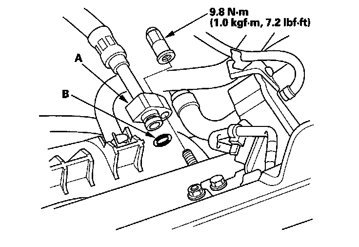 11. Install the fuel feed hose (A). Use new O-ring (B).