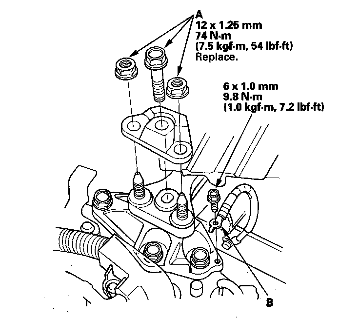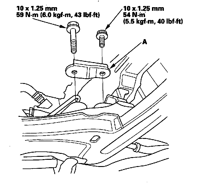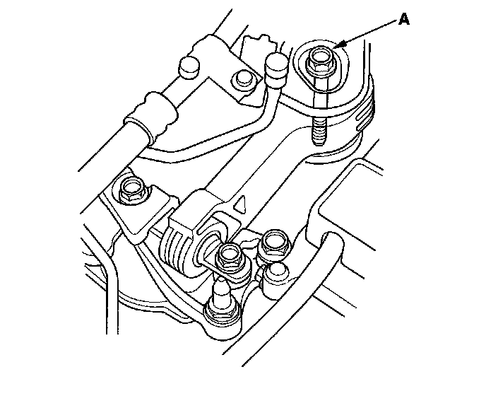 8. Tighten the new transmission mounting bolt and nuts (A).