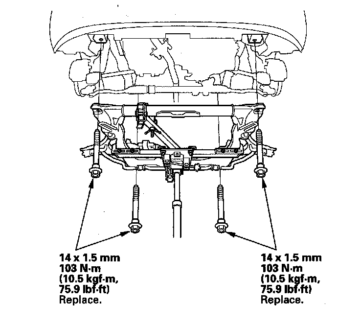 15. Tighten the new front subframe body mount bracket mounting bolts on both sides.