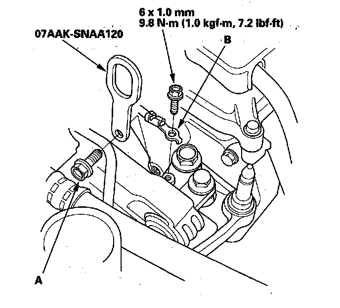3. Install the 1.8 support eyelet (07AAK-SNAA400) behind the breather pipe (A) and down to the thread hole (B) on the cylinder head.