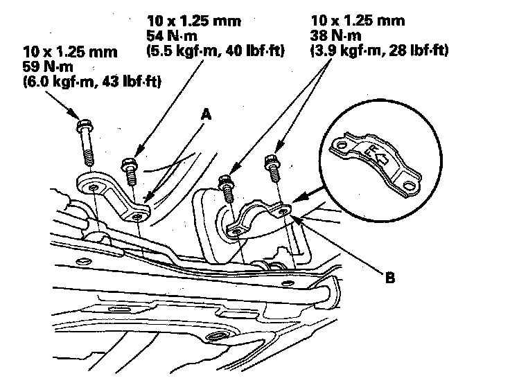 24. Install the power steering (P/S) line on the clamp (A), then install the P/S line brackets (B) on the subframe.