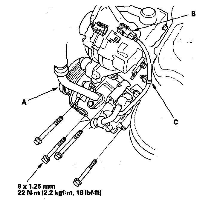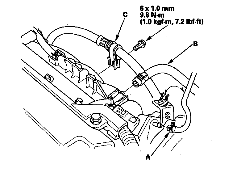 43. Install the vacuum hose (A), the brake booster vacuum hose (B), and the power steering (P/S) hose clamp (C).