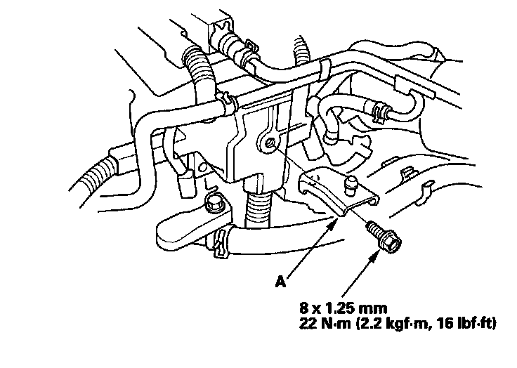 23. Install the steering gearbox stiffener (A), then tighten the steering gearbox mounting bolt and stiffener bolt.