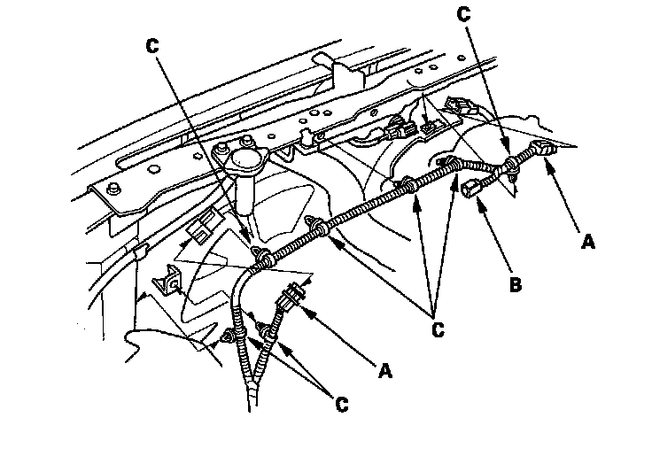 6. Disconnect the fan motor connectors (A) and hood switch connector (B), then remove the harness clamps (C).