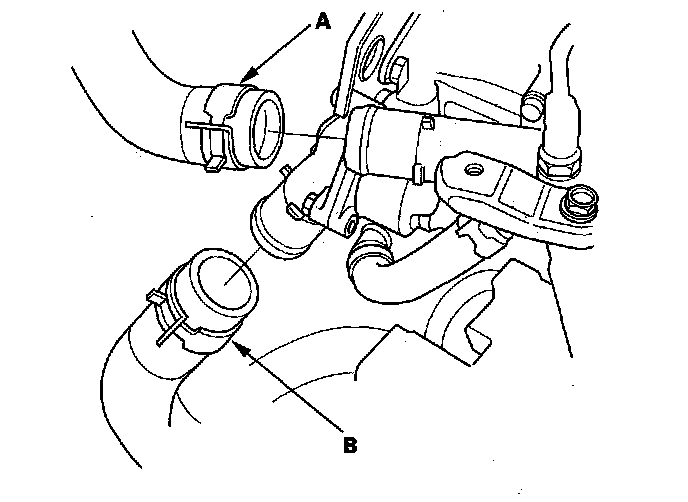8. Disconnect the upper radiator hose (A) and lower radiator hose (B).