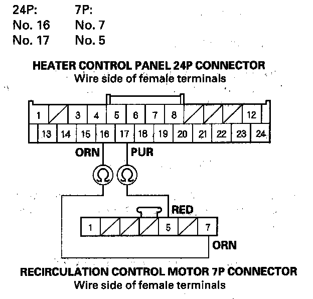 11. Check for continuity between the following terminals of the heater control panel 24P connector and the recirculation control motor 7P connector.