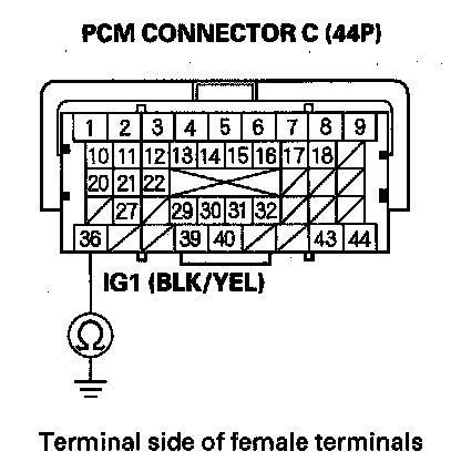 32. Check for continuity between PCM connector terminal A36 and body ground.