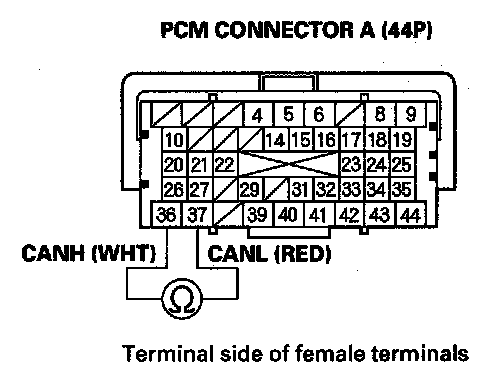 32. Measure resistance between PCM connector terminals A36 and A37.