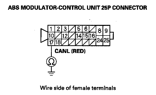 18. Check for continuity between ABS modulator-control unit 25P connector terminal No. 17 and body ground.